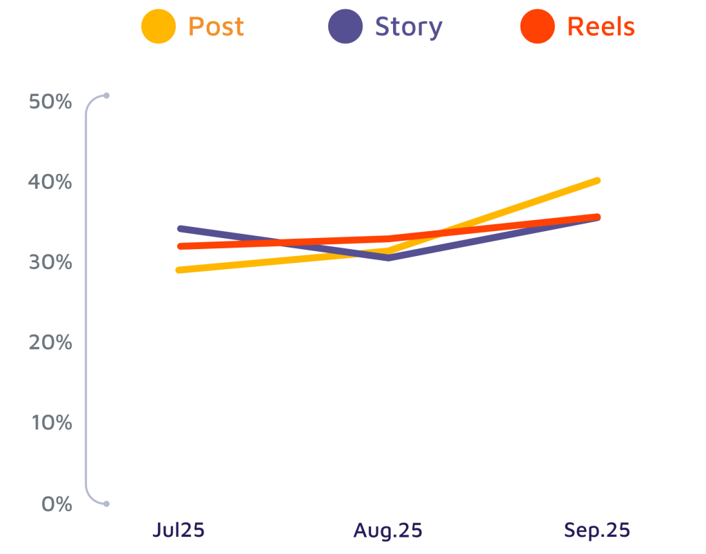 This indicates that while Stories continue to serve instant engagement needs, brands prioritize more permanent content formats during the season kickoff. In other words, although Stories remain essential, the increased preference for post and Reels formats in September reflects a strategic shift toward sustainable visibility.