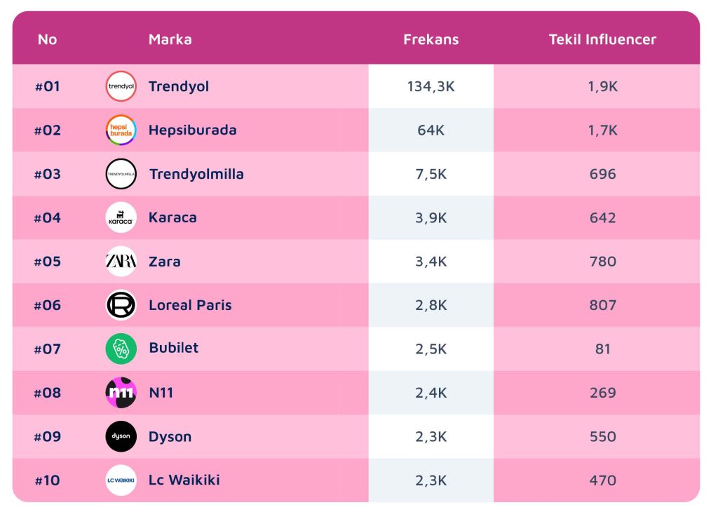 Bu markalar, influencer başına ortalama 63 içerik üreten .com sektörünün “always-on” (sürekli aktif) stratejisini en iyi uygulayan oyuncuları. Instagram onlar için sadece bir reklam mecrası değil, her an aktif olan bir satış kanalı. 2025’in başlıca reklamverenleri ise burada: